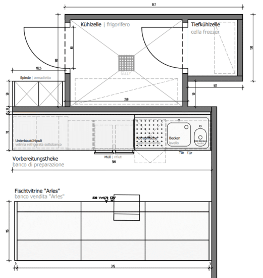 Zum Verkauf steht eine professionelle Fischverkaufsabteilung inklusive passender Vorbereitungsmöbel. Die gesamte Anlage besteht aus hochwertigem Edelstahl und wurde für einen effizienten, hygienischen und gutstrukturierten Arbeitsablauf konzipiert.