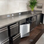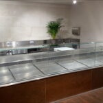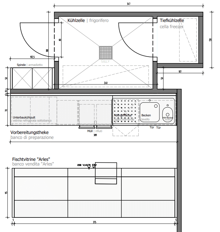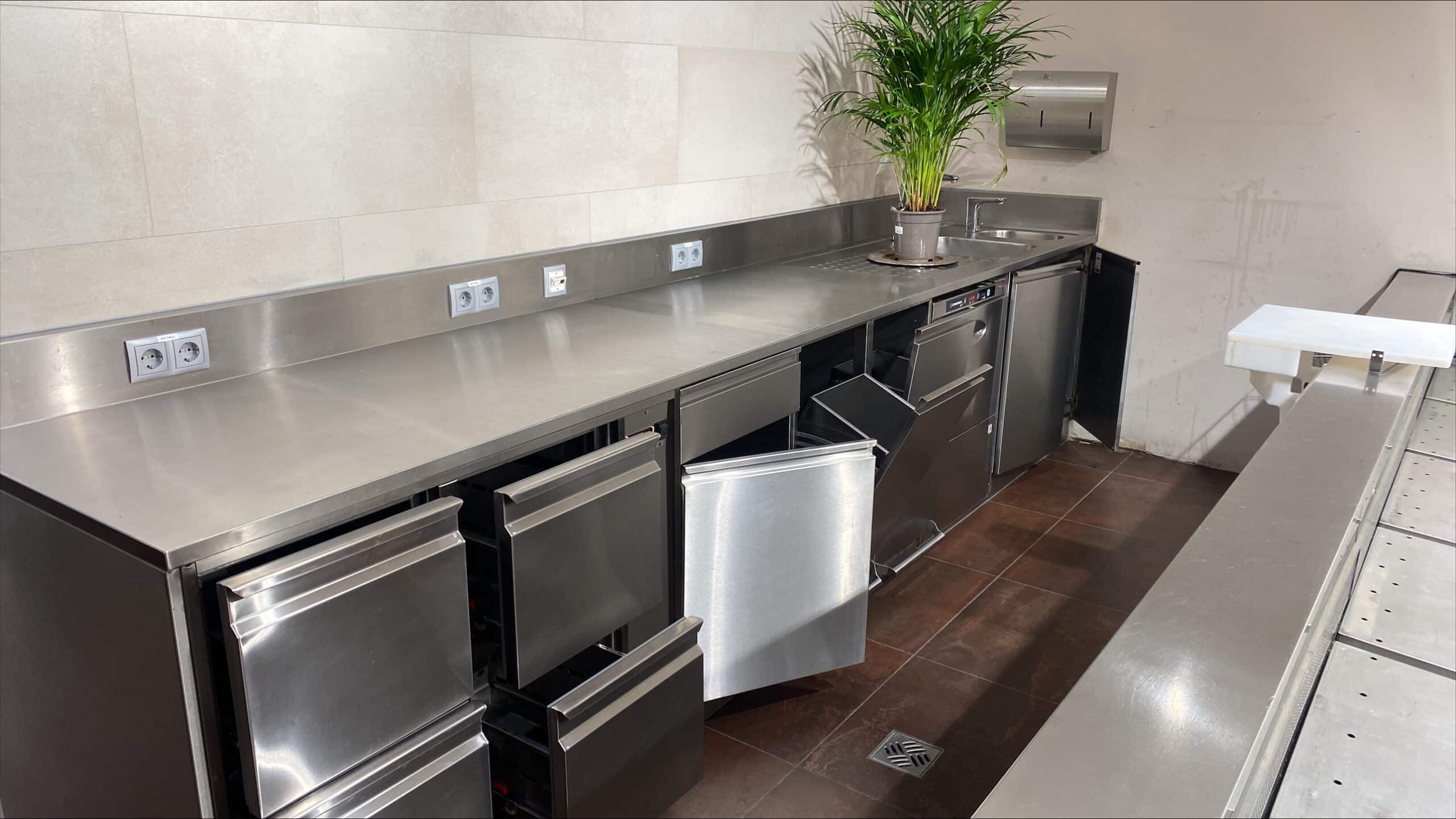 Zur Anlage gehört außerdem eine Crasheismaschine und eine umfangreiche Vorbereitungstheke, ebenfalls vollständig aus Edelstahl gefertigt. Sie misst ca. 3,89 m und ist mit einem Unterbaukühlpult samt Steuerung ausgestattet. Zusätzlich stehen Unterbaukästen mit Lade und Tür zur Verfügung, ebenso zwei praktischeKipp-Mülleimer. Das großzügige Spülbecken mit den Maßen 450 × 450 × 250 mm verfügt über eine integrierte Abtropffläche, unter der Platz für eine Spülmaschine vorgesehen ist.